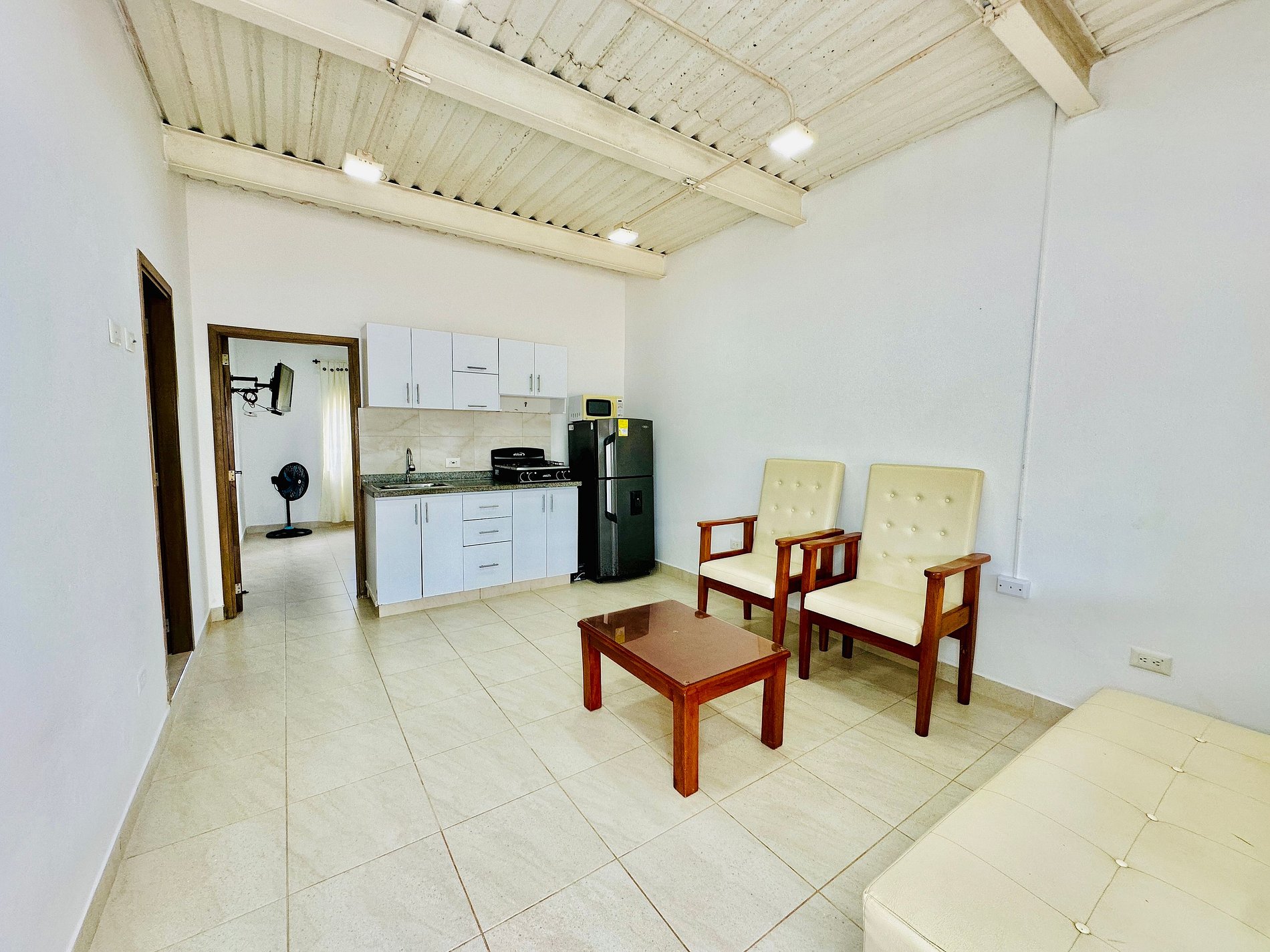 Confort garantizado: Cabañas con aire acondicionado, sala con cocina equipada (incluye nevera) y baño privado.